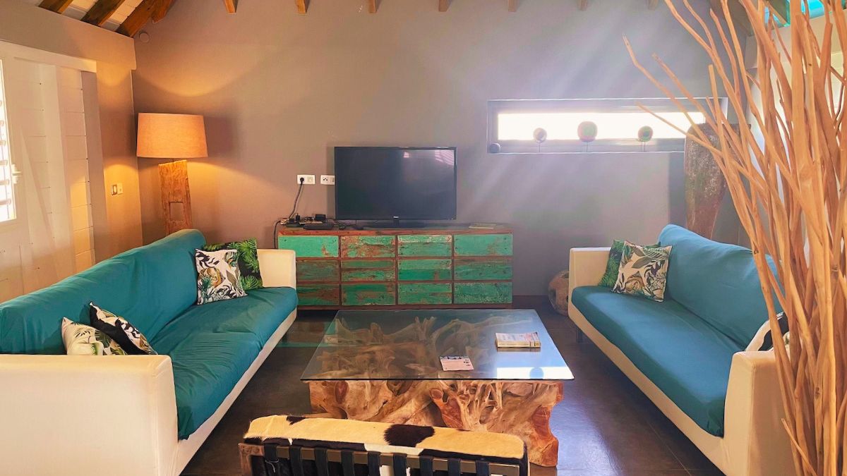 Notre salon est aménagé avec des canapés en cuir profonds et des fauteuils invitants, enveloppés dans du tissus, offrant le cadre parfait pour des moments de détente après une journée d'aventures sous le soleil de la Guadeloupe.